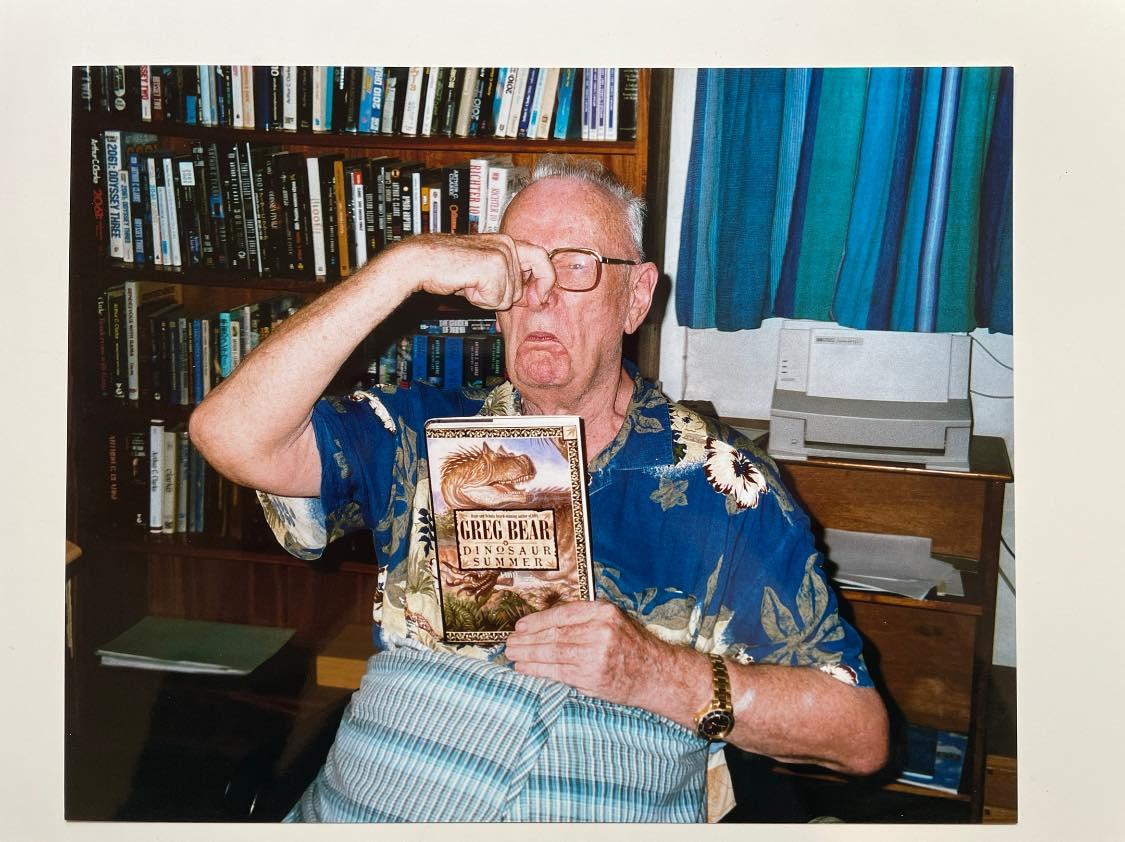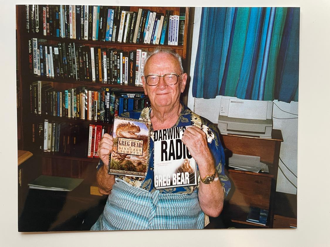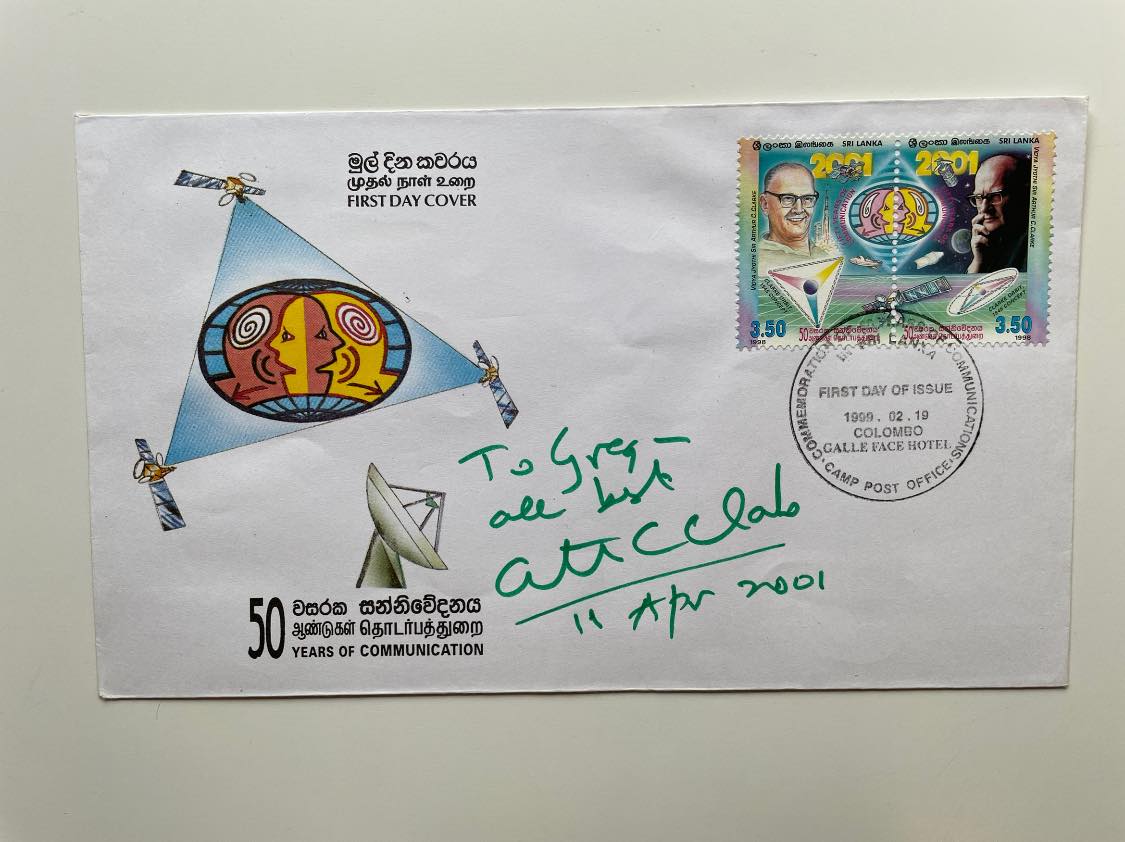 Greg was a big fan of Arthur C. Clarke and was delighted to meet him a couple of times as well as have a sporadic correspondence. Dr. Karl Anders traveled to Sri Lanka several times and would bring items of exchange between them. Here’s Sir Arthur posing with two of Greg’s books. Greg especially loved the pose of Clarke holding his nose over DINOSAUR SUMMER. One of the things Clarke sent was this first day cover of a Sri Lankan stamp honoring himself.