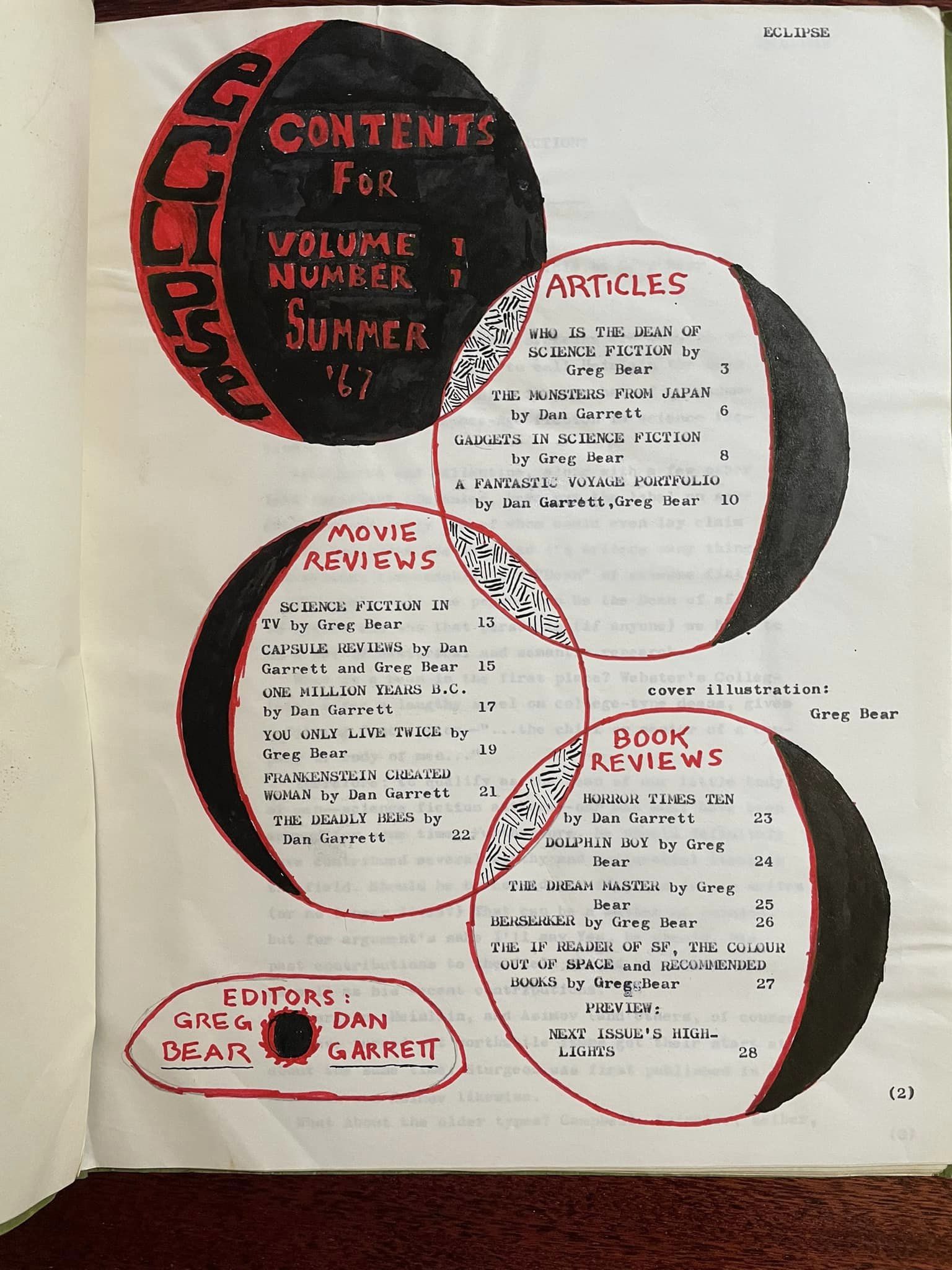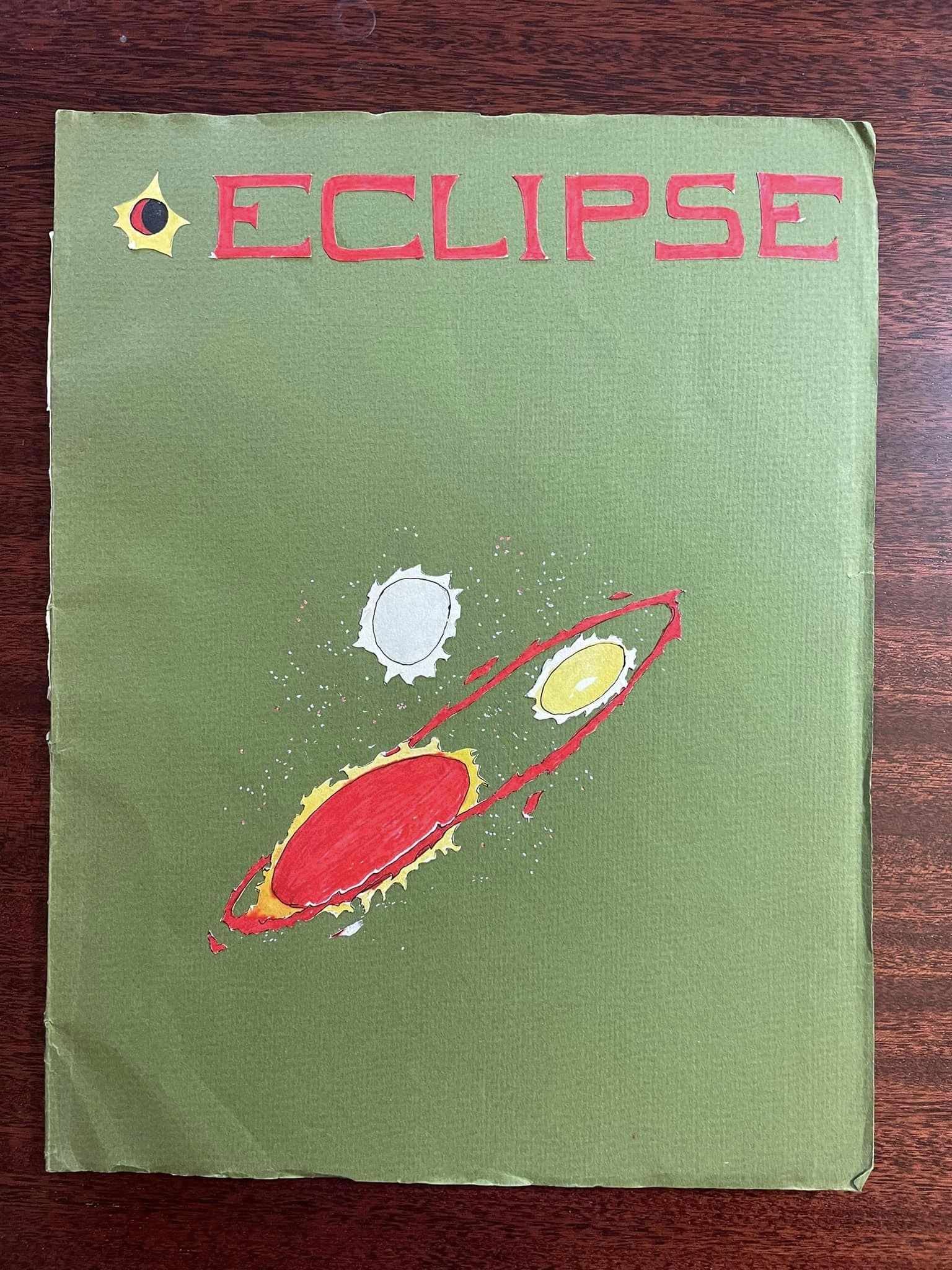 Found in the archives, the fanzine ECLIPSE, by Greg and his cousin, Dan Garrett. Hand typed, original illustrations, hand bound. Likely the only copy. Cover is a collage of painted paper shapes glued to heavier paper.