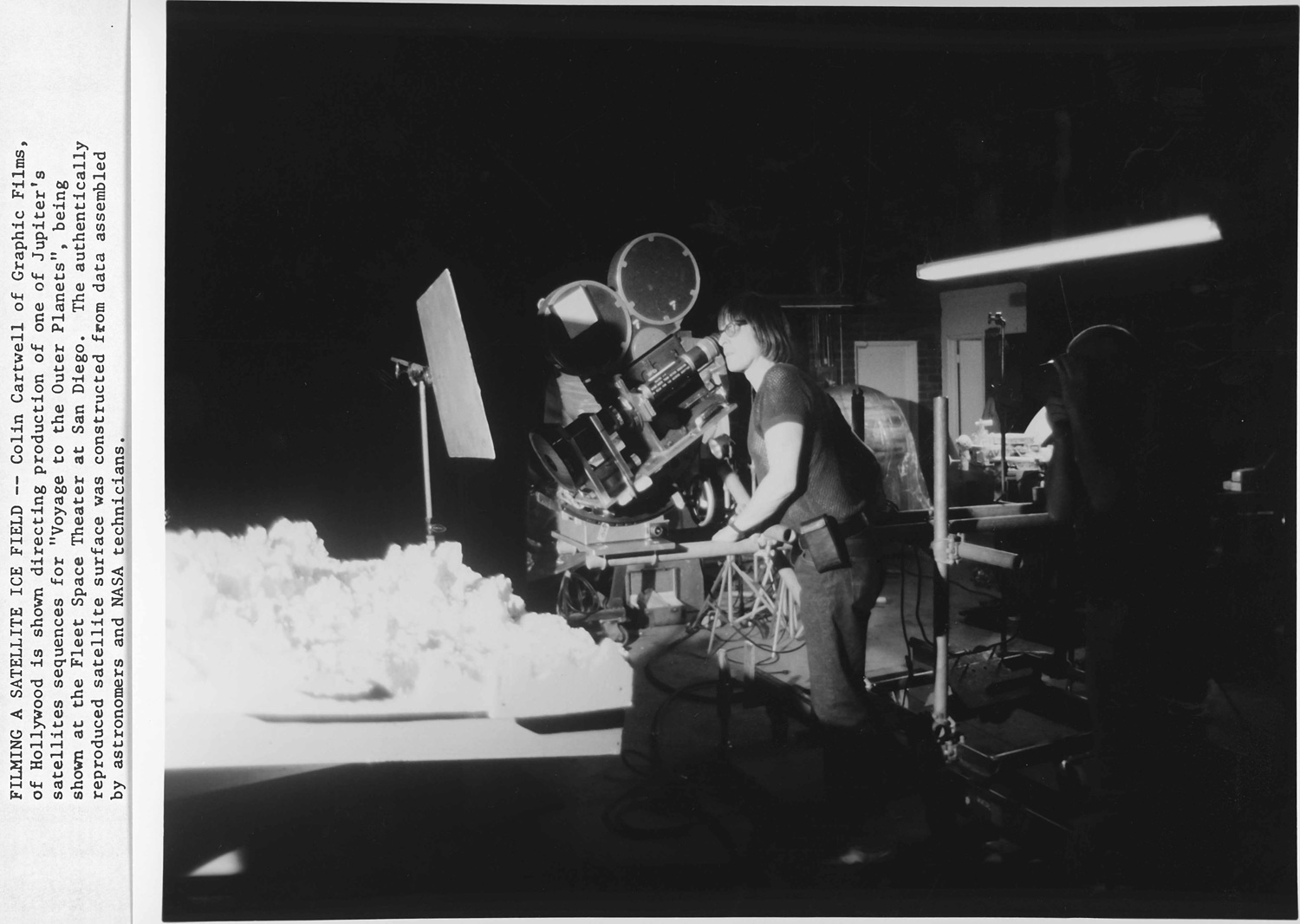 For me, spending those long hours under the star dome, watching and re-watching Voyage¸ made me intimately aware of the spaceship and the planets and moons that made up our circuit of the outer solar system. The model of the ship shown here was equipped with a rotating habitat for the (unseen) voyagers; it was in fact mounted on a record turntable.* The beautiful depictions of moons and planets were made by shaping great oblate spheroids and carefully spray-painting them in technically convincing colors based on telescope photographs.  (In one black and white photo, you can see Jupiter resting under a plastic cover in the background while Cantwell films a Jovian moon.)