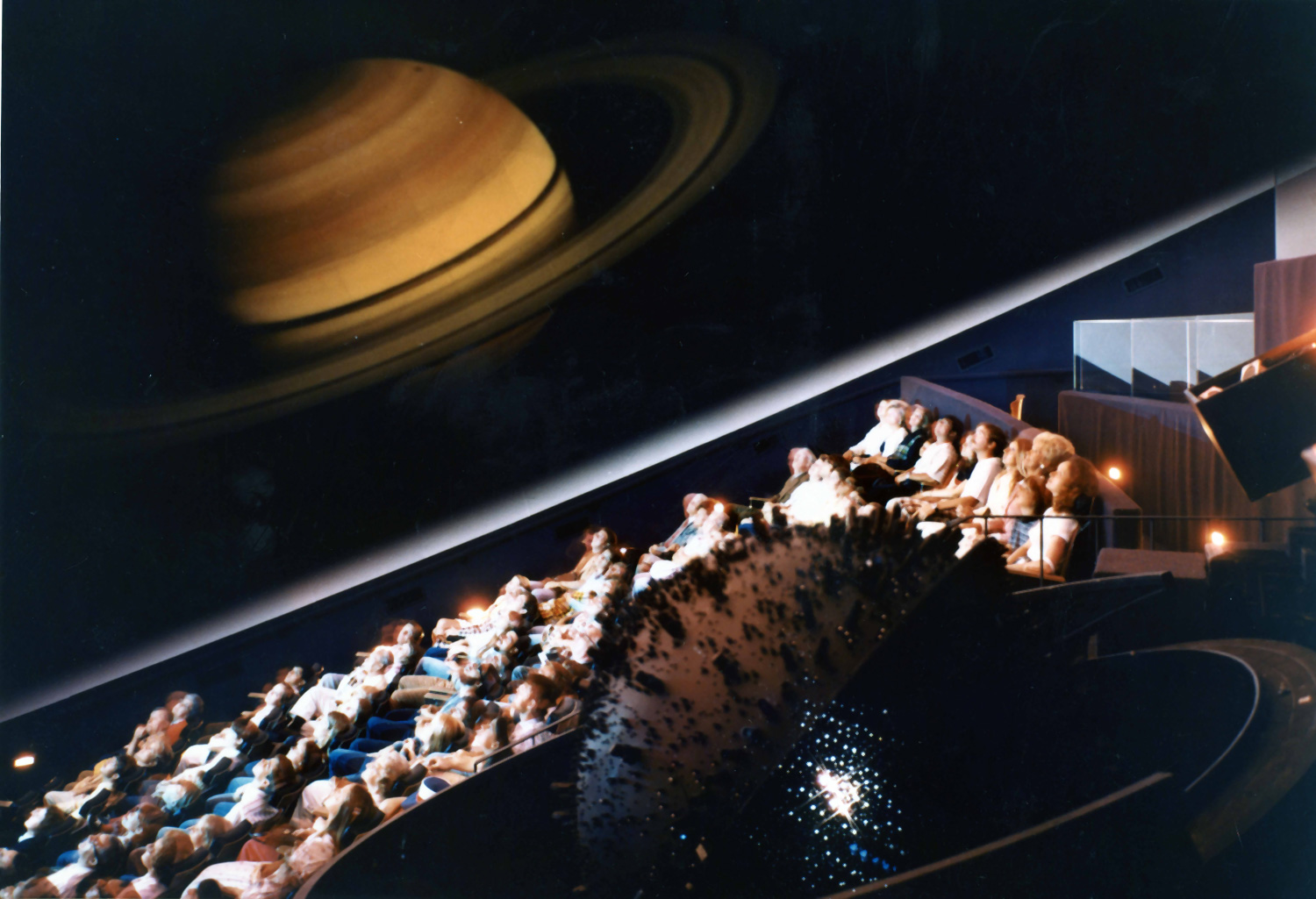 The first production given this full multi-media treatment was Voyage to the Outer Planets, a tour of the solar system beyond Mars. The script postulated that the futuristic spaceship Delta V (referring to change in velocity) was about to take the entire theater full of patrons on a tour around the outer planets. Mind you, this was in 1973-74, concurrent with the Pioneer probes but before Voyager, and so it all had to be done with special effects--and that task was assigned to Colin Cantwell's Graphic Films. Cantwell had worked on 2001: a Space Odyssey and was assisted by John Dykstra. Both would later move on to Star Wars; but for the time being, their work, showcased on a huge format screen, offered the most technically accurate film experience since 2001 itself.